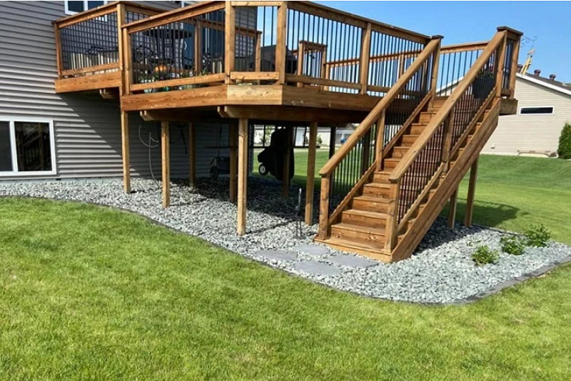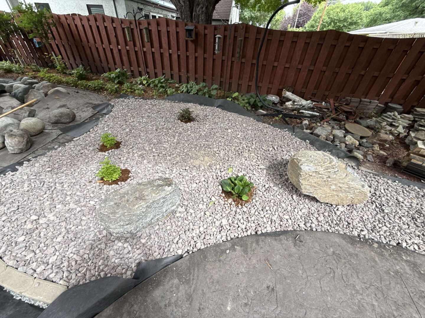 We remove any existing landscaping, haul and grade dirt, install fabric, and lay new rock or mulch designed for low-maintenance.